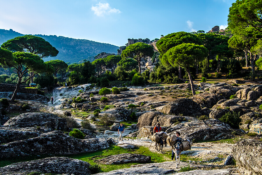 Wie schon vor tausenden von Jahren beginnt unser Tag frühmorgens mit kaltem Wasser und frischer Ziegenmilch. Unser Weg führt durch duftende Pinienwälder zu der Höhensiedlung vom Dorf Bağarcık. Geht es zunächst steil bergauf, so folgt dann ein recht ebener, bequemer Weg. Unterwegs Option das Stylos Kloster zu besuchen. Die Tagesetappen sind anstrengend, jedoch von gut dosierten Pausen mit leckerem Essen so aufgelockert, dass Mensch und Tier sich ausreichend erholen und auch genießen können. Der Anblick der für uns lasttragenden Tiere motiviert immer aufs Neue. Die Ruinen des altrömischen Zeus-Tempels sind Wegweiser in Richtung unseres Ziels. In Bağarcık angekommen werden wir standesgemäß vom Bürgermeister und seiner Familie zu einem traditionellen Abendessen bei sich zu Hause empfangen. Duschgelegenheit. Übernachtet wird gemeinsam in einem Schlafsaal im Dorfhaus. HOCH 1000 m, RUNTER 650 m über 10 km.