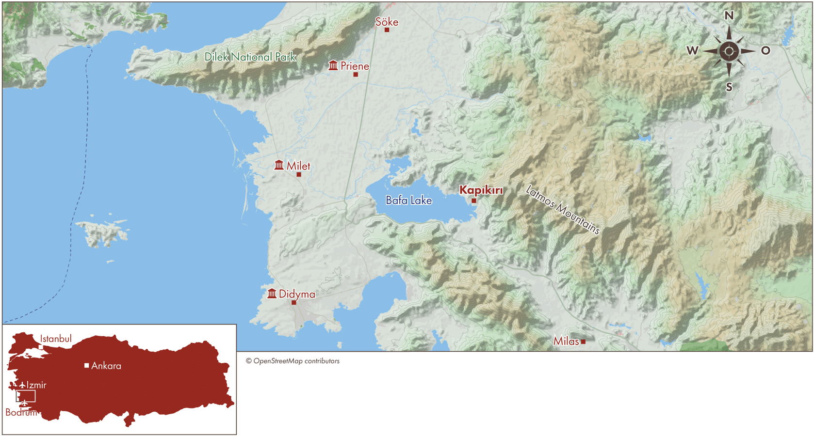 The Latmos Mountain range, called Beșparmak Daǧları (Five Finger Mountains) due to their rugged silhouette, rise up steeply to the north of Bafa Lake, in antiquity forming the northwestern tip of the kingdom of Caria. Their wildly fissured masses of gneiss, granite and slate dominate the landscape from afar, creating a bizarre rocky labyrinth to pick through on our way to the top – a landscape that has enabled this area to remain effectively untouched to this day. This is also one of the archeologically richest areas in western Turkey, with hundreds of Neolithic rock paintings having been found in caves and overhangs scattered throughout the landscape. It is no wonder that the mountains have been a sacred site for all manner of cults and religions since time immemorial, and the setting for the ancient myth of Endymion and Selene.